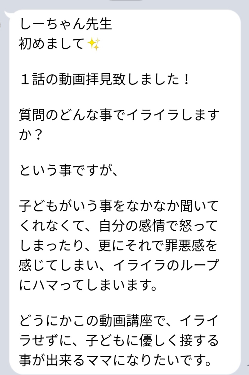 1ヶ月目 STEP1 ママと赤ちゃんの心理学(6本の動画が届きます) 1週目 誰も教えてくれないママになるという心理 2週目 バーストラウマのお話 3週目 愛情貯金を貯める!10歳までの心の仕組み 4週目 罪悪感を手放し、負のスパイラルから抜け出す方法 5週目 長男・長女が可愛くないママ必見!兄弟の関わり方 2ヶ月目 STEP2 人生の棚卸し(5本の動画が届きます) 1週目 毎回イライラ・ザワザワするパターンを洗い出すワーク 2週目 人生の振り返り(幼少期からママになるまで) 3週目 あなたの人生は何色?あなたの人生観を色から知るワーク 4週目 インナーチャイルドが癒されるワーク 3ヶ月目 STEP3 子どもの発達と心の成長とママの関わり方(11本の動画が届きます) 1週目 赤ちゃん期の心の成長(夜泣き、人見知り、後追い) 2週目 幼児期(イヤイヤ期・魔の2歳児・3歳の反抗期) 3週目 学童期(小1の壁、ギャングエイジ、思春期) 4週目 青年期(中2の壁、受験など) 4ヶ月目 STEP4 カラー(個性)に合わせた関わり方(15本の動画が届きます) 1週目 子どものカラータイプを知る 2週目 ママのカラータイプを知る 3週目 言われて嬉しい言葉・NGワードを知る 4週目 我が子に合った関わり方を知る 5ヶ月目 STEP5 イライラした時の対処方法を知る(5本の動画が届きます) 1週目 なるほど!スッキリ!イライラした時にやること 2週目 イライラの原因と感情の仕組み 3週目 超絶ポジティブ!ハッピー脳の作り方 4週目 心を満たす優しさ溢れる愛のエネルギーのお話 6ヶ月目 STEP6 なりたいママになっている!コンサルティングで理想のママへ!(5本の動画が届きます) 1週目 何でも願いが叶うならワーク 2週目 理想のママ像は? 3週目 そのためにできることを探そう! 4週目 私の生きたい人生を決める!セッション 週に1度、動画がメールで届きます。 各stepごとのテキストはPDFでメールに添付し、お送りしております。 ご自宅でお好きなタイミングで講座を受講して頂けます。 講座の動画に閲覧期間はなく、永久に観れるので 6か月をすぎたあとでも繰り返しインプットしていただけます。 そして動画をみて疑問に思ったことや質問はLINEでメッセージをください。 しーちゃん先生があなたの質問に必要に応じてお答えいたします!